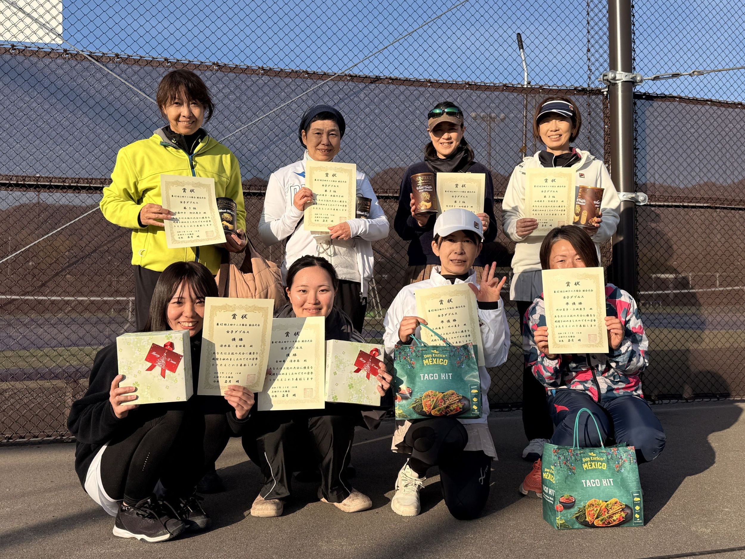 | 2025年11月16日 古戦場テニスコートで納会大会が開催されました。 朝方は冷えていましたが、昼前になればだんだんと温かくなってきて、 半そで短パンでプレーしている姿もありました。 この納会大会で2025年度の大会はすべて終了となります。 本年度も大会エントリーありがとうございました。 引き続き来年度もよろしくお願いいたします。 |